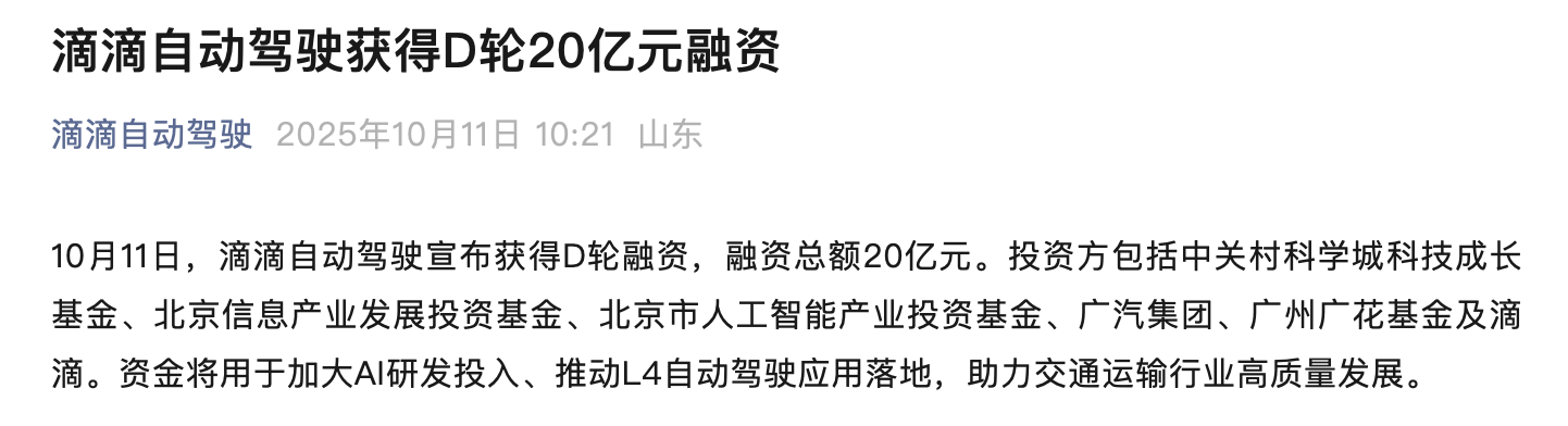 本轮融资的投资方包括中关村科学城科技成长基金、北京信息产业发展投资基金、北京市人工智能产业投资基金、广汽集团、广州广花基金及滴滴。资金将用于加大AI研发投入、推动L4自动驾驶应用落地,助力交通运输行业高质量发展。