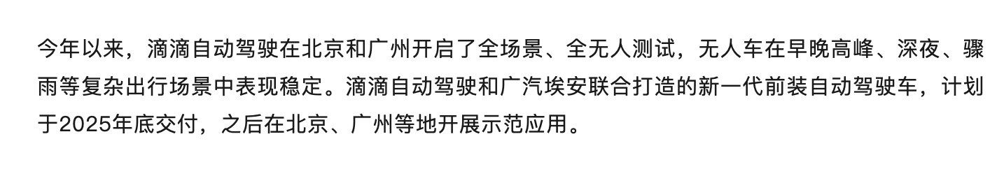 值得一提的是,今年以来,滴滴自动驾驶在北京和广州开启了全场景、全无人测试。滴滴自动驾驶和广汽埃安联合打造的新一代前装自动驾驶车,计划于2025年底交付,之后在北京、广州等地开展示范应用。